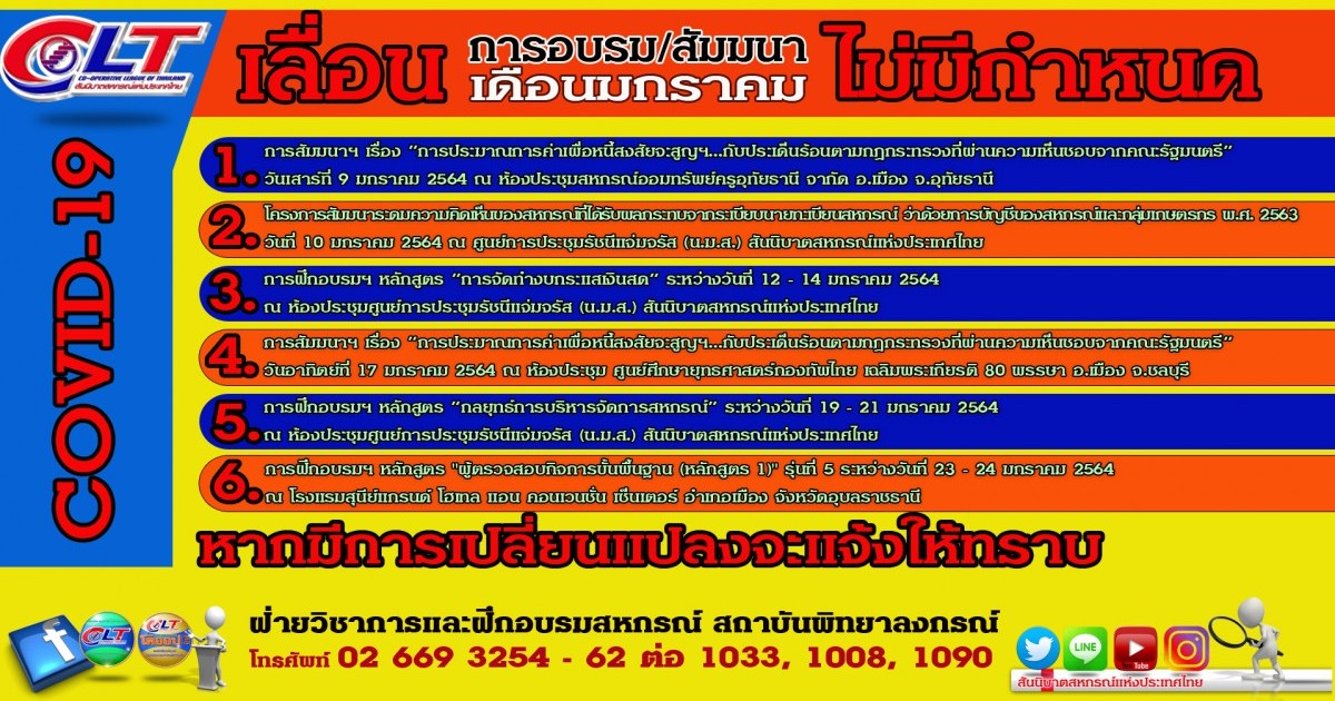 จนกว่าสถานการจะคลี่คลาย สันนิบาตสหกรณ์แห่งประเทศไทย (สสท.) จะแจ้งการเปลี่ยนแปลงกำหนดการจัดอบรมและสัมมนาอีกครั้งหนึ่ง