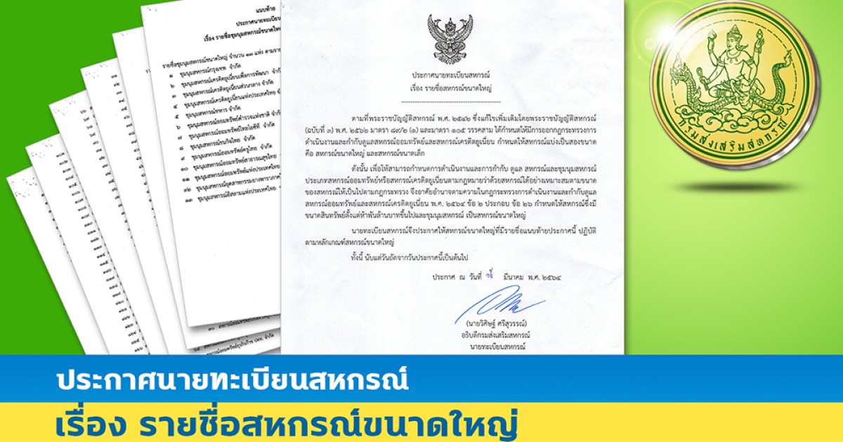 ประกาศนายทะเบียนสหกรณ์ เรื่อง รายชื่อสหกรณ์ขนาดใหญ่