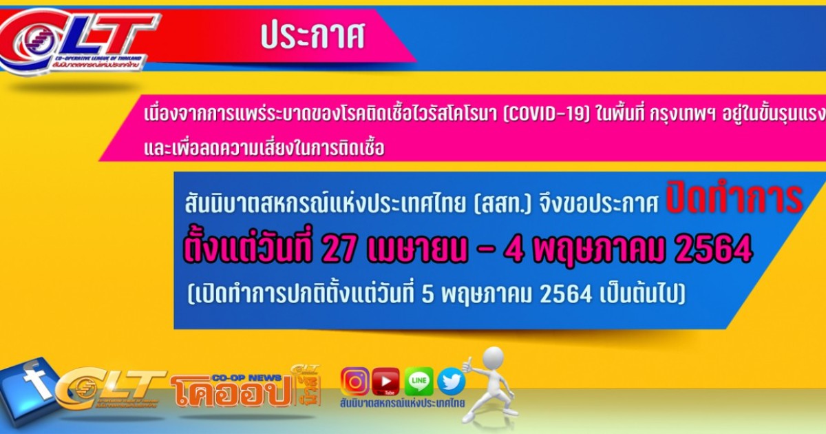 สันนิบาตสหกรณ์ฯ ขอปิดดำเนินการตั้งแต่วันที่ 27เมษายน ถึงวันที่ 4 พฤษภาคม 2564