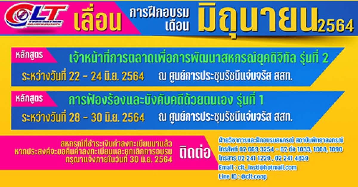 แจ้ง เลื่อนการฝึกอบรม เดือนมิถุนายน 2564 ครั้งที่ 2