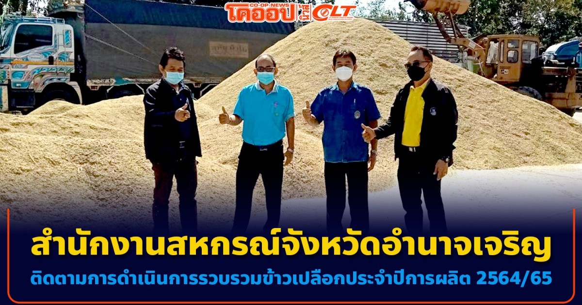 วันที่ 10 พฤศจิกายน 2564 นายสุรเดช ปัดสำราญ ผู้อำนวยการกลุ่มส่งเสริมและพัฒนาการบริหารการจัดการสหกรณ์ พร้อมด้วยนายวัชรินทร์ มามาก ผู้อำนวยการกลุ่มส่งเสริมและพัฒนาธุรกิจสหกรณ์ ตรวจเยี่ยมติดตามการดำเนินการรวบรวมข้าวเปลือกประจำปีการผลิต 2564/65 ของสมาชิกสหกรณ์การเกษตรเพื่อการตลาดลูกค้า ธ.ก.ส.อำนาจเจริญ จำกัด ผลการรวบรวมตั้งแต่ 1 พฤศจิกายน 2564 ราคาเฉลี่ยกิโลกรัมละ 8.60 บาท ปริมาณรวม 707 ตัน เป็นเงิน 6,085,534 บาท