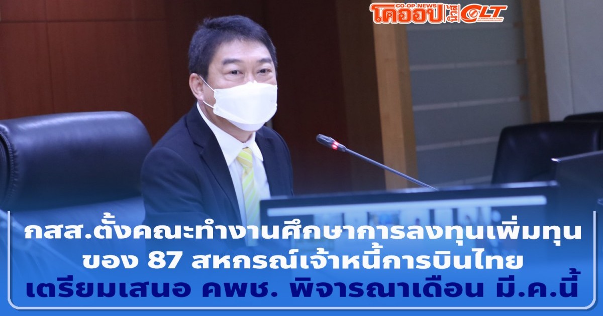 กสส . ตั้งคณะทำงานศึกษาการลงทุนเพิ่มทุนของ 87 สหกรณ์เจ้าหนี้การบินไทย เตรียมเสนอ คพช. พิจารณาเดือน มี.ค. นี้