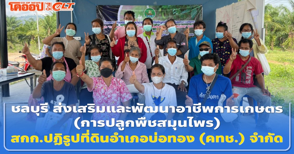 สำนักงานสหกรณ์จังหวัดชลบุรี เป็นหน่วยงานส่วนภูมิภาคของกรมฯ จึงดำเนินการจัดอบรมโครงการส่งเสริมและพัฒนาอาชีพเพื่อแก้ไขปัญหาที่ดินทำกินของเกษตรกร หลักสูตร “การส่งเสริมและพัฒนาอาชีพการเกษตรที่เหมาะสมกับพื้นที่ (การปลูกพืชสมุนไพร)” จังหวัดชลบุรี เพื่อส่งเสริมพัฒนาอาชีพและการตลาดของเกษตรกร ตามแนวเศรษฐกิจพอเพียงภายใต้การใช้ระบบอนุรักษ์ดินและน้ำอย่างยั่งยืน ให้สามารถแก้ปัญหาหรือบรรเทาปัญหาความเดือดร้อนของเกษตรกร สร้างอาชีพและเพิ่มรายได้ให้แก่สมาชิกอย่างยั่งยืนต่อไป