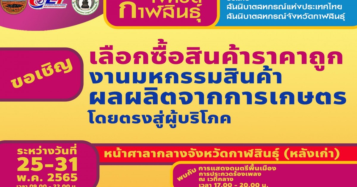 จังหวัดกาฬสินธุ์ และสันนิบาตสหกรณ์จังหวัดกาฬสินธุ์ จัดงานมหกรรมสินค้าผลผลิตจากสมาชิกสหกรณ์ทุกประเภท เป็นผลผลิตโดยตรงสู่ผู้บริโภค ระหว่างวันที่ 25-31 พฤษภาคม 2565 เพื่อสานต่อนโยบายของสันนิบาตสหกรณ์แห่งประเทศไทย ณ บริเวณสนามหน้าศาลากลางจังหวัดกาฬสินธุ์ (หลังเก่า) มีสินค้าแปรรูป ผ้าพื้นเมือง ผลิตผลทางเกษตร การแปรรูปอาหาร ฯลฯ มีการแสดงบนเวทีกลางทุกคืน