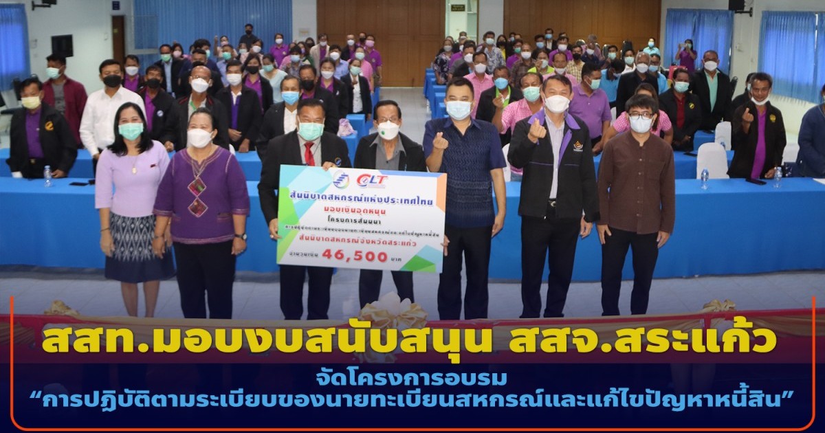 สสท.มอบงบสนับสนุน สสจ.สระแก้ว จัดอบรมโครงการ “การปฏิบัติตามระเบียบของนายทะเบียนสหกรณ์และแก้ไขปัญหาหนี้สิน”