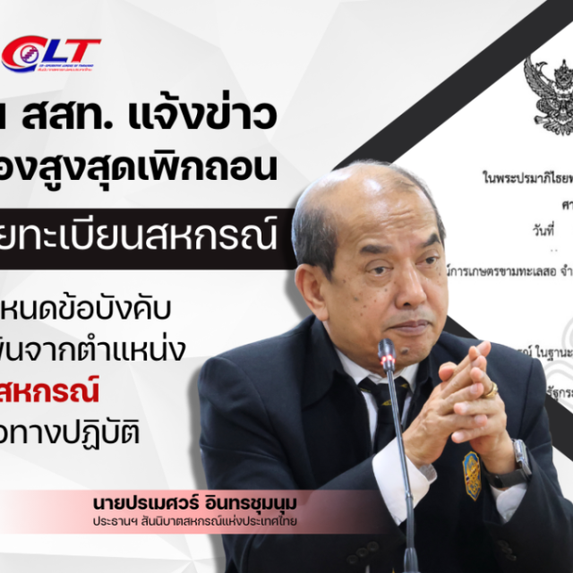 ประธาน ฯ สสท. แจ้งข่าว ศาลปกครองสูงสุดเพิกถอนระเบียบนายทะเบียนฯ การพ้นจากตำแหน่งของผู้จัดการสหกรณ์