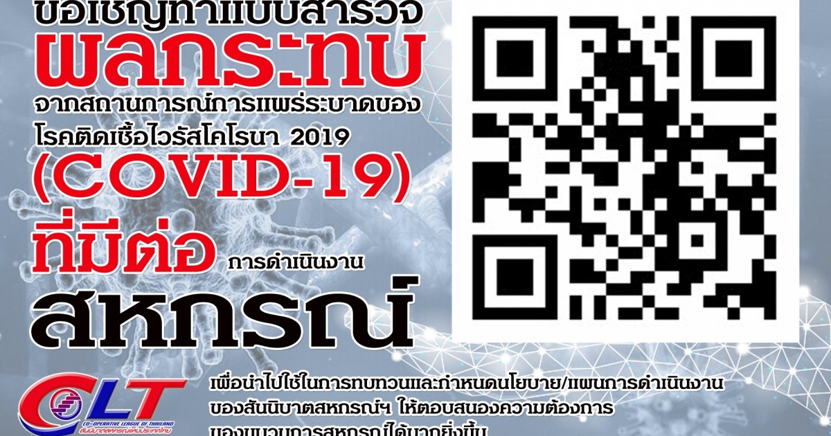 สันนิบาตสหกรณ์แห่งประเทศไทย ได้จัดทำการสำรวจผลกระทบจากสถานการณ์การแพร่ระบาดของโรคติดเชื้อไวรัสโคโรนา 2019 (COVID-19)  ที่มีต่อการดำเนินงานสหกรณ์ เพื่อรวบรวมข้อมูลเกี่ยวกับความเห็นจากสหกรณ์ เพื่อนำไปใช้ในการทบทวนและกำหนดนโยบาย/แผนการดำเนินงานของสันนิบาตสหกรณ์ฯ ให้ตอบสนองความต้องการของขบวนการสหกรณ์ได้มากยิ่งขึ้น จึงขอความร่วมมือท่านในการตอบแบบสอบถามและขอขอบคุณเป็นอย่างสูงที่ให้ความร่วมมือมา ณ โอกาสนี้