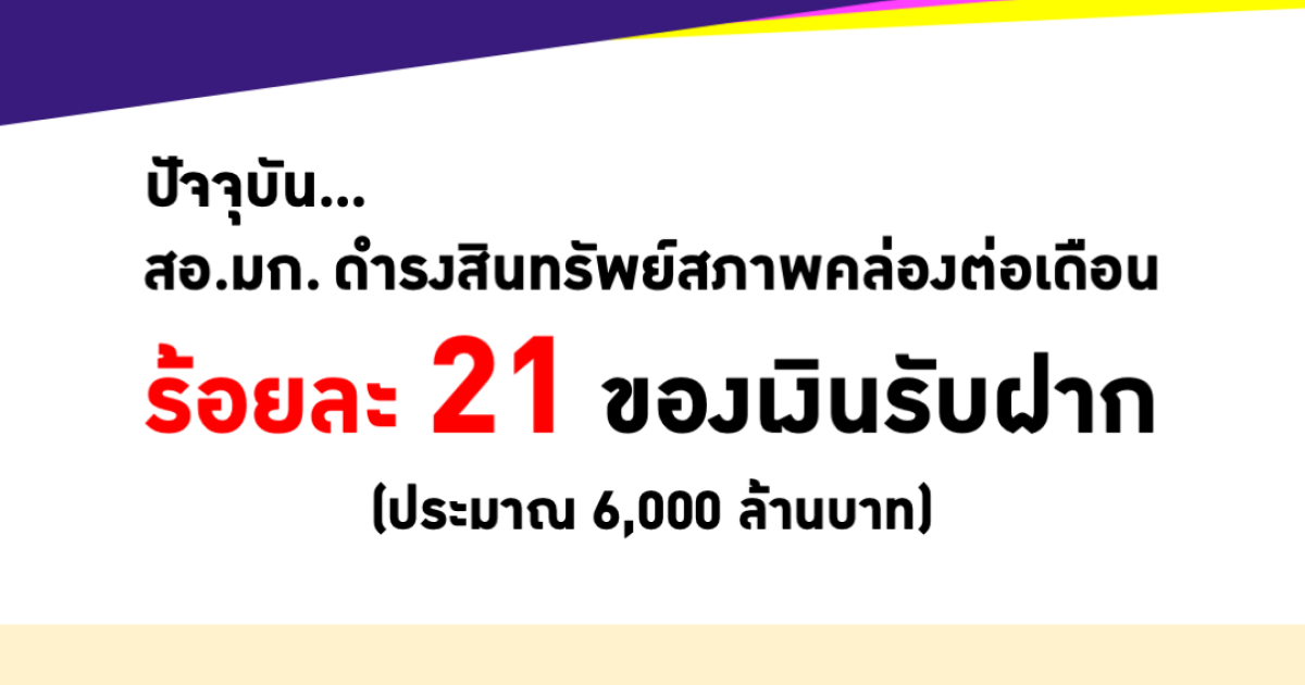3.2สอ.มก.มีการดำรงสินทรัพย์สภาพคล่องเป็นสัดส่วนของเงินรับฝากสูงกว่าเกณฑ์ที่นายทะเบียนกำหนดไว้ (ไม่ต่ำกว่าร้อยละ 1 ของ เงินรับฝากทั้งหมด) โดยปัจจุบัน สอ.มก. ได้ดำรงสินทรัพย์สภาพคล่องต่อเดือนประมาณ 6,000 ล้านบาท (ร้อยละ 21 ของเงินรับฝาก 28,000 ล้านบาท)