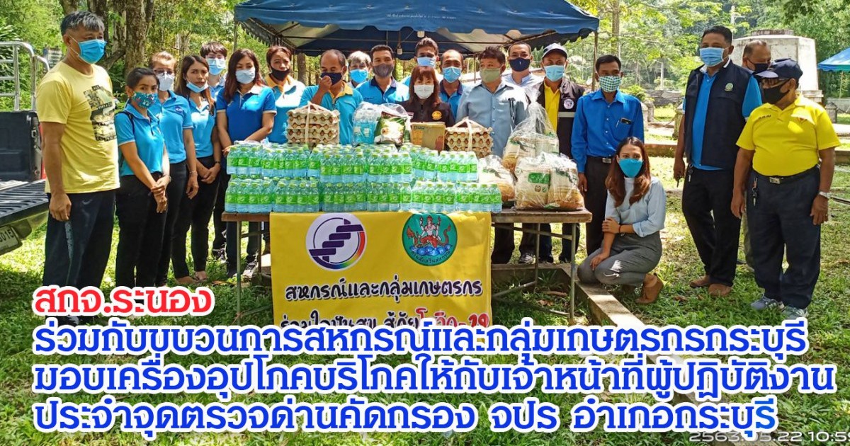 วันที่ 22 พฤษภาคม 2563 ณ จุดตรวจด่านคัดกรอง ตำบล จปร อำเภอกระบุรี จังหวัดระนอง นายยุทธนา แก้วน้อย สหกรณ์จังหวัดระนองร่วมกับขบวนการสหกรณ์และกลุ่มเกษตรกรในพื้นที่อำเภอกระบุรี ได้มอบเครื่องอุปโภคบริโภค เช่น ข้าวสาร กาแฟ น้ำดื่ม ไข่ ให้แก่ผู้ที่ผู้ปฏิบัติหน้าที่ประจำจุดตรวจด่านคัดกรอง เพื่อนำไปประกอบอาหาร โดยมี นางเพ็ญศรี รสสุคนธ์ ปลัดอาวุโส อ.กระบุรี พร้อมด้วยเจ้าหน้าที่ฝ่ายปกครองอำเภอกระบุรี บุคลากรทางการแพทย์ องค์กรปกครองส่วนท้องถิ่นและผู้ที่มีส่วนเกี่ยวข้องให้การต้อนรับ