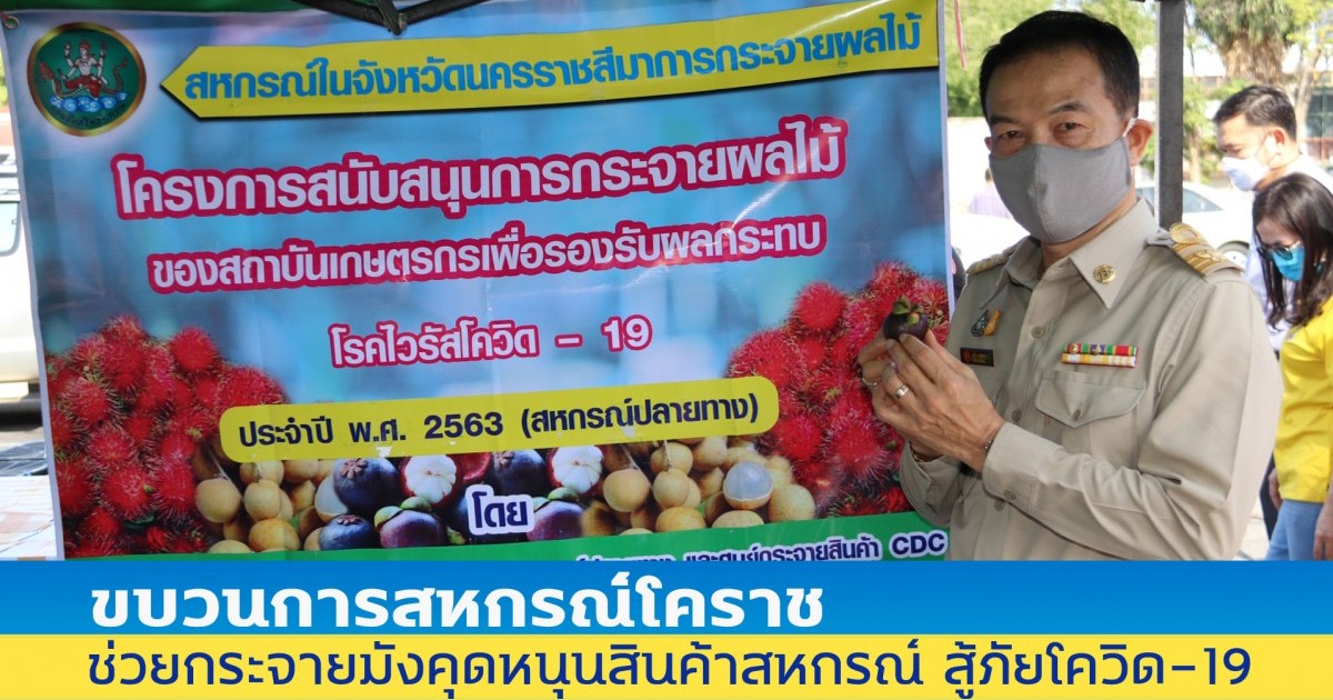 สหกรณ์จังหวัดนครราชสีมา เปิดเผยว่า กรมส่งเสริมสหกรณ์ได้จัดทำโครงการสนับสนุนการกระจายผลไม้ของสถาบันเกษตรกรเพื่อรองรับผลกระทบจากโรคไวรัสโควิด-19 โดยในจังหวัดนครราชสีมามีสหกรณ์การเกษตรที่เข้าร่วมโครงการ จำนวน 5 สหกรณ์ เพื่อบรรเทาผลกระทบผลไม้ส่งออกต่างประเทศที่เคยได้ราคาดี จึงใช้เครือข่ายขบวนการสหกรณ์ที่มีอยู่ทุกจังหวัดช่วยกระจายสินค้าสู่ผู้บริโภคภายในประเทศ เพื่อรักษาเสถียรภาพด้านราคาส่งผลให้เกษตรกรมีรายได้เพียงพอและได้รับผลตอบแทนคุ้มค่าการลงทุน