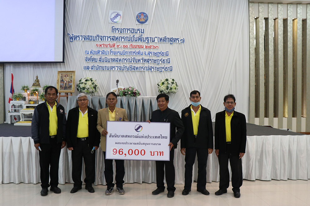 (9 กันยายน 2563) สันนิบาตสหกร์แห่งประเทศไทย (สสท.) โดยนายวิฑูรย์ แนวพานิช กรรมการดำเนินการฯ ร่วมงานเปิดโครงการและบรรยายพิเศษในโครงการอบรม "ผู้ตรวจสอบกิจการสหกรณ์ขั้นพื้นฐาน" (หลักสูตร ๑) ซึ่งจัดขึ้นระหว่างวันที่ 9 - 11 กันยายน 2563 โดยสันนิบาตสหกรณ์จังหวัดสุราษฎร์ธานี ณ โรงแรมนิภา การ์เด้นท์ อ.เมือง จ.สุราษฎร์ธานี ในการนี้ได้มอบเงินสนับสนันการจัดโครงการให้แก่นายวีระศักดิ์ ศรีบุรุษ ประธานกรรมการสันนิบาตสหกรณ์จังหวัดสุราฎร์ธานี จำนวน 96,000 บาท