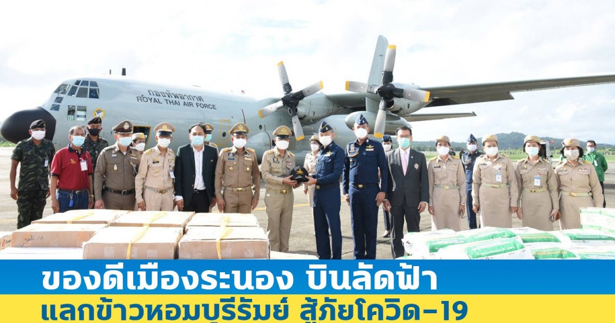 (9 มิ.ย. 2564 ) ที่ท่าอากาศยานระนอง ต.ราชกรูด อ.เมือง จ.ระนอง นายสมเกียรติ ศรีษะเนตร ผู้ว่าราชการจังหวัดระนอง พร้อมด้วย นายโชตินรินทร์ เกิดสม รองผู้ว่าราชการจังหวัดระนอง นายสุธี ขันทอง สหกรณ์จังหวัดระนอง นายทรงธรรม ใจเอื้อ ประธานสหกรณ์การเกษตรเพื่อการตลาดลูกค้า ธ.ก.ส.ระนอง (สกต.ระนอง) ประธานหอการค้าจังหวัดระนอง หัวหน้าส่วนราชการ และหน่วยงานที่เกี่ยวข้อง ร่วมต้อนรับ พลอากาศโท ตรีพล อ่องไพฑูรย์ รองเสนาธิการทหารอากาศ เป็นผู้แทนผู้บัญชาการทหารอากาศ ในการรับมอบข้าวหอมมะลิ จากจังหวัดบุรีรัมย์ และส่งมอบอาหารทะเลแปรรูปและผลิตภัณฑ์เด่นของจังหวัดระนอง ในกิจกรรม “ของดีเมืองระนอง บินลัดฟ้า แลกข้าวหอมบุรีรัมย์ สู้ภัยโควิด-19” ภายใต้โครงการเชื่อมโยงสินค้าและผลิตภัณฑ์ทางการเกษตรระหว่างจังหวัดระนอง กับ จังหวัดบุรีรัมย์ สู้ภัยโควิด-19