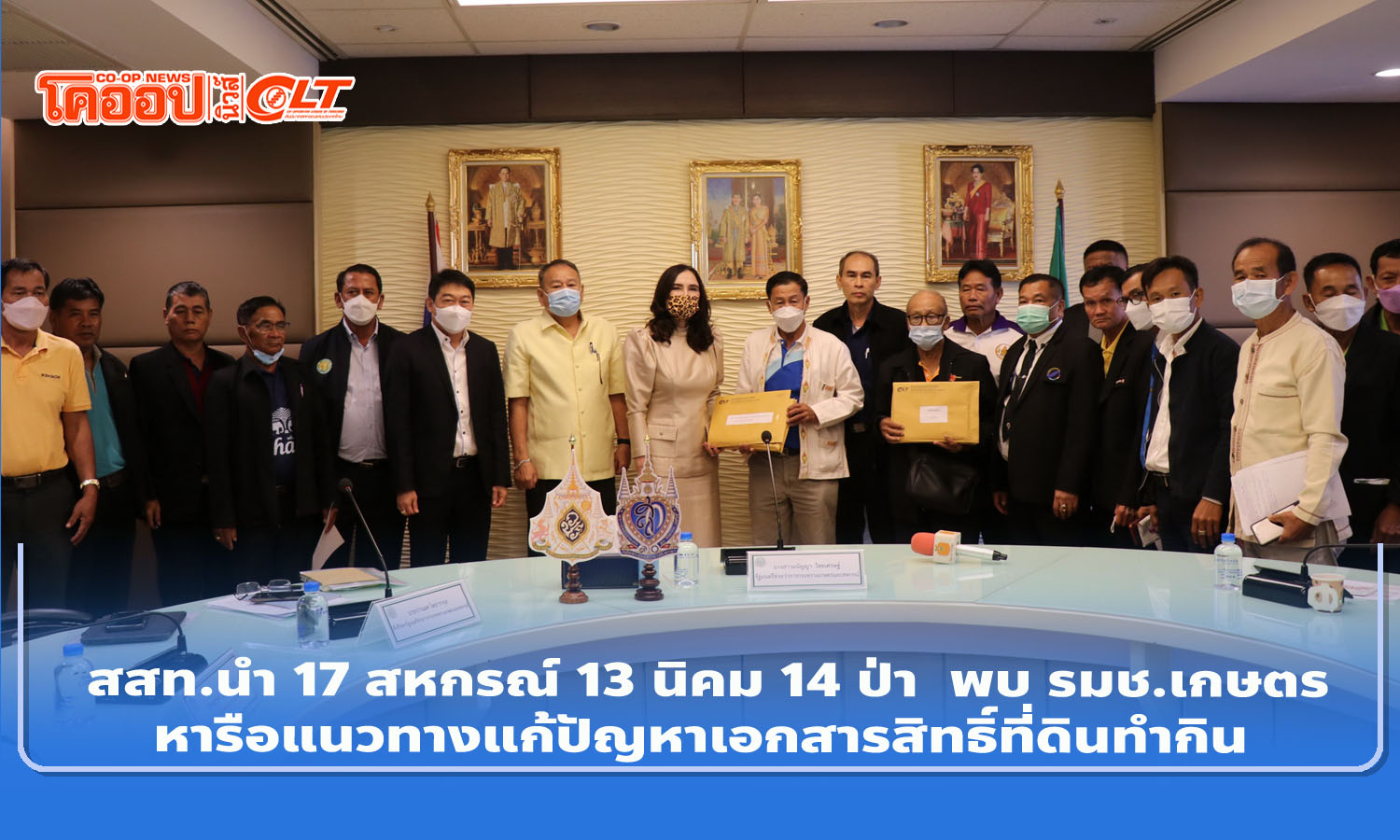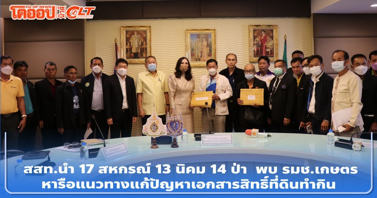 (วันที่ 12 ตุลาคม 2565)  สันนิบาตสหกรณ์แห่งประเทศไทย และกลุ่มเครือข่ายสหกรณ์นิคม 4 ภาค 17 สหกรณ์ 13 นิคม 14 ป่า โดยนายปัณฐวิชญ์ มุ่งสมัครศรีกุล ผู้อำนวยการสันนิบาตสหกรณ์ฯ  นำคณะจากสหกรณ์นิคมแม่แจ่ม จำกัด ,สหกรณ์นิคมนาคอเรือ จำกัด, สหกรณ์นิคมบางสะพาน จำกัด ,สหกรณ์นิคมพันชาลี จำกัด , สหกรณ์นิคมวังทองจำกัด สหกรณ์นิคมคลองสวนหมาก จำกัด, สหกรณ์นิคมลานสัก จำกัด, สหกรณ์นิคมดงมูล 1 จำกัด,สหกรณ์นิคมดงมูล 2 จำกัด,สหกรณ์นิคมด่านช้างจำกัด,สหกรณ์นิคมเนินมะปรางจำกัด ,สหกรณ์นิคมแคนดง จำกัด โดยมีผู้นำกลุ่ม ประกอบด้วยนายเจียง นาอุดม กรรมการสหกรณ์นิคมดงมูล 2 จำกัด , นายนิตยฺ์ ตั่นอนุพันธ์ ประธานนิคมบางสะพาน และนายสุพจน์ ริจ่าม ประธานกลุ่มเครือข่ายสหกรณ์นิคม 4 ภาค 17 สหกรณ์ 13 นิคม 14 ป่า  นำคณะสหกรณ์ที่ได้รับความเดือดร้อนจากที่ดินทำกิน  กว่า30คน เข้าพบรัฐมนตรีช่วยว่าการกระทรวงเกษตรและสหกรณ์ นางสาวมนัญญา ไทยเศรษฐ์ ณ ห้องประชุมกระทรวงเกษตรและสหกรณ์ โดยรัฐมนตรีช่วยว่าการกระทรวงเกษตรและสหกรณ์ ยินดีรับเรื่อง และจะเร่งแก้ปัญหาโดยเร่งด่วน โดยจะให้กรมส่งเสริมสหกรณ์ได้ยื่นเรื่องขอแนวทางผ่านทางกระทรวงเกษตรสหกรณ์เพื่อเรียกร้องสิทธิ์ในที่ดิน ให้13นิคม 14ป่า 17สหกรณ์ โดยภายหลังจากการหารือในที่ประชุม ทางภาครัฐรับเรื่องประสานงานต่อเพื่อหาแนวทางแก้ไขปัญหา โดยอธิบดีกรมส่งเสริมสหกรณ์นายวิศิษฐ์ ศรีสุวรรณ ได้เสนอแนวทางการแก้ปัญหา ผ่านทางกรมป่าไม้ และหน่วยงานที่เกี่ยวข้อง หากกรมป่าไม้เห็นชอบ ทางกรมส่งเสริมสหกรณ์ จะได้ดำเนินการ เร่งให้หน่วยงานที่เกี่ยวข้อง ประกาศในราชกิจจานุเบกษา เพื่อนำมาซึ่งการขอโฉนดที่ดินให้สหกรณ์ ต่อไป