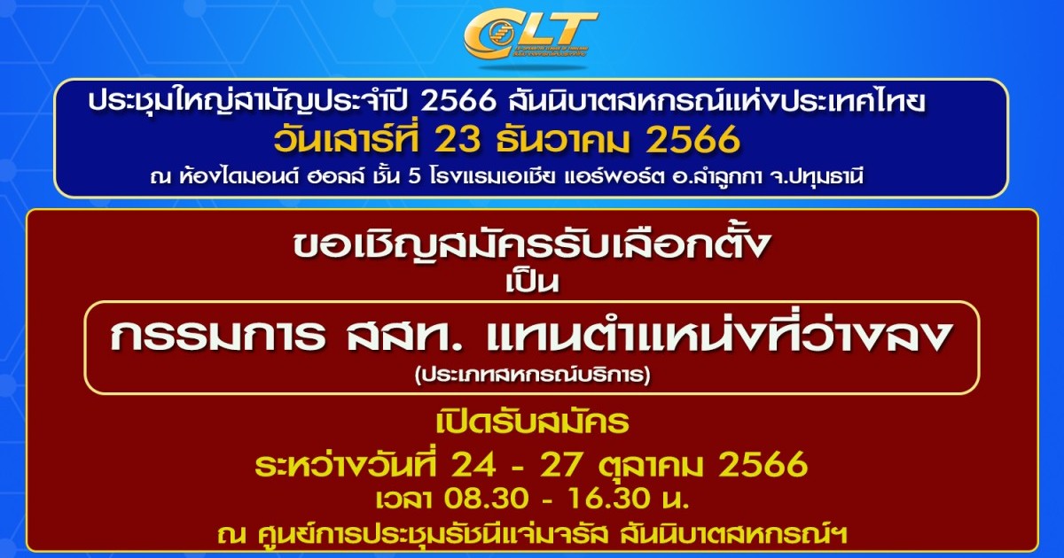 "ขอเชิญผู้แทนสหกรณ์ประเภทสหกรณ์บริการสมัครรับเลือกตั้งเป็นกรรมการสันนิบาตสหกรณ์แห่งประเทศไทย แทนตำแหน่งที่ว่างลง"