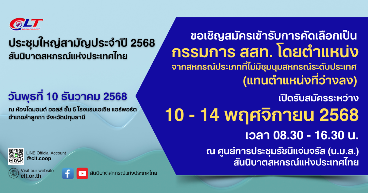 ประกาศ การสมัครเข้ารับการคัดเลือกเป็นกรรมการดำเนินการสันนิบาตสหกรณ์ฯ โดยตำแหน่งจากสหกรณ์ประเภทที่ไม่มีชุมนุมสหกรณ์ระดับประเทศ (แทนตำแหน่งที่ว่างลง)